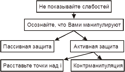 Опыт показывает, что в большинстве случаев манипулятор отступает уже перед пассивной защитой. Ибо самое опасное в манипуляции — ее стремительность, неожиданность, когда у Вас нет времени сообразить, как выйти из положения. Повторение просьбы, во-первых, дает Вам время для ответа, во-вторых, выявляет истинный интерес манипулятора и сбивает заготовленное им распределение ролей. Но, конечно же, явно предпочтительнее активная защита.