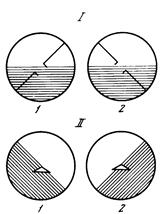 1 — вид индикации "с земли на самолет": 1 — левый крен. 2 — правый крен; II — вид индикации "с самолета на землю": 1 — левый крен, 2 — правый крен