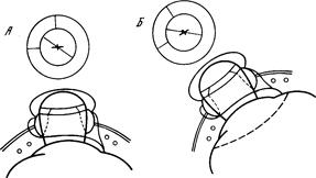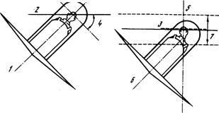 а — летчик держит голову прямо по отношению к вертикальной оси самолета, и горизонт кажется ему наклонным; б — летчик вынужден поворачивать голову, чтобы горизонт остался фиксированным. 1 — ось, проходящая через голову и тело параллельно вертикальной оси самолета; 2 — реальный горизонт; 3 — плоскость, проходящая через глаза, 4 — угол между линией горизонта и плоскостью глаз; 5 — ось, проходящая через голову; 6 — ось, проходящая через тело; 7 — вертикальное перемещение горизонта
