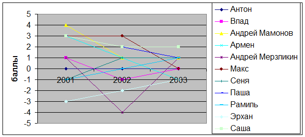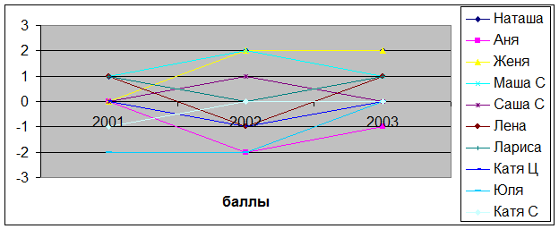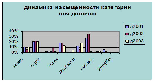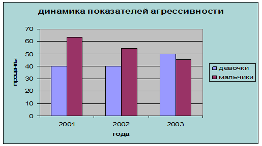 При применении статистического критерия Фишера было достоверно установлено снижение агрессивности у мальчиков по группе в 2002 г. (р=0,02) и в 2003 г. (р=0,016)