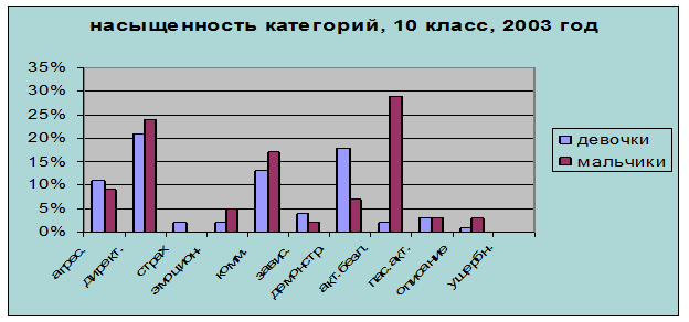 Наиболее насыщенными категориями являются Активность (27%), Директивность (22 %), Коммуникация (18 %) для девочек; Директивность (29 %), Активность (27 %), Коммуникация (13%) для мальчиков. Из приведенных данных видно, что для девочек наиболее важным является жизненная активность, на втором месте стоит директивность, т.е. управление, руководство, на третьем - коммуникация, а именно межличностное общение. У мальчиков иная ситуация. Категории те же, а значимость иная. На первом месте директивность, на втором - активность, на третьем - коммуникация.