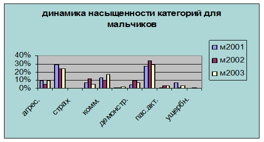 4. Были обнаружены гендерные различия: у девочек уровень агрессии сохраняется, у мальчиков достоверно снижается. Наиболее насыщенными категориями ответов были: Активность, Директивность, Коммуникативность.у мальчиков на протяжении трех лет процент «агрессиных» снижался с 63,63% до 45,45. Насыщенность категорий ответов такая же как и у девочек, а именно, самыми насыщенными стали: Активность, Директивность, Коммуникативность. Были обнаружены гендерные различия: у девочек уровень агрессии сохраняется, у мальчиков достоверно снижается.