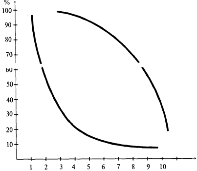 Ход выработки навыка принято выражать в так называемых кривых упражнениях, выражающих соотношение между успехами, достигнутыми в обучении, и упражнением. Среди многообразных кривых, которые дает упражнение, часто различают два основных типа: кривые с положительным и отрицательным ускорением (рис. 1). [11, 117] Та или иная форма кривой зависит от различных условий, прежде всего от особенностей содержания деятельности. Очень распространенным типом является кривая с отрицательным ускорением, т.е. с наиболее быстрым восхождением вначале и замедляющимся на каждом последующем отрезке. Такая кривая отображает ход обучения, при котором наиболее значительные успехи дает начальный период. Каждый же последующий период равной величины дает не равный, а прогрессивно относительно все меньший эффект.