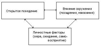 Разработанная Бандурой модель-триада взаимного детерминизма показывает, что хотя на поведение влияет окружение, оно также частично является продуктом деятельности человека, то есть люди могут оказывать какое-то влияние на собственное поведение. Например, грубое поведение человека на званом вечере может привести к тому, что действия окружающих его людей будут, скорее, наказанием, а не поощрением для него. И напротив, дружелюбный человек на том же самом вечере может создать окружение, в котором для него будет достаточно поощрения и мало наказания. Во всяком случае, поведение изменяет окружение. Бандура также утверждал, что, благодаря сноси необычайной способности использовать символы, люди могут думать, творить и планировать, то есть они способны к познавательным процессам, которые постоянно проявляются через открытые действия.