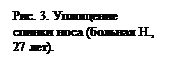 Особенности формы носа относятся к наиболее часто встречающимся при этом заболевании аномалиям: нос короткий, с плоской переносицей и расширенным основанием, что связано с недоразвитием костей носа (рис.№3); ноздри широкие, открыты в вертикальной плоскости; нередко наблюдается асимметричное расположение носовой перегородки носовых раковин; слизистая носа атрофична и часто подвергается катаральным воспалениям.