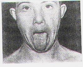 Рот обычно полуоткрыт, губы толстые, бесформенные, плохо очерченные; нижняя губа выпячена, отвисает. На губах очень часто появляются рецидивирующие вертикальные трещины, которые возникают преимущественно в углах рта или по средней линии на нижней губе. Очень типичен грубый, утолщенный язык с характерными глубокими поперечными бороздами (рис.№5).