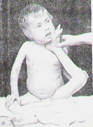 При болезни Дауна значительные изменения обнаруживаются со стороны строения грудной клетки. Грудная клетка узкая и часто деформирована. Встречается асимметричная форма грудной клетки вследствие выпячивания или западания одной ее половины. Наиболее частой деформацией грудной клетки является так называемая «куриная грудь»- киле видное выпячивание грудины и « воронкообразная грудь»- углубление по средней линии грудины. Выраженность этих деформаций может варьировать в больших пределах – от грубой до легкой степени.