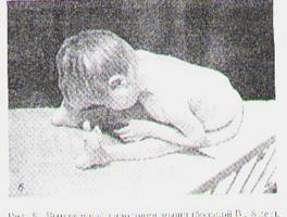 Наряду с расстройствами ВНД, при болезни Дауна отличается и недостаточность моторики. Больные неуклюжи, не способны выполнять тонкие, координированные движения руками, не умеют правильно соразмерять движения, хотя настоящих мозжечковых расстройств не отличается. Дети с глубокими степенями у. о. Так и не научатся ходить, хотя параличи и расстройства координации у них отсутствуют (рис. 13).