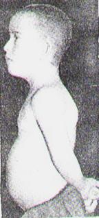 Дети, страдающие болезнью Дауна, отстают в росте от сверстников. Рост, взрослых мужчин с болезнью Дауна, редко превышает 155см, рост женщин-145см (Engler 1958). Фигура больных приземистая, неуклюжая, плечи опущены, голова наклонена вперед. Живот – вследствие гипотонии брюшных мышц - увеличен в размере, выпячен.