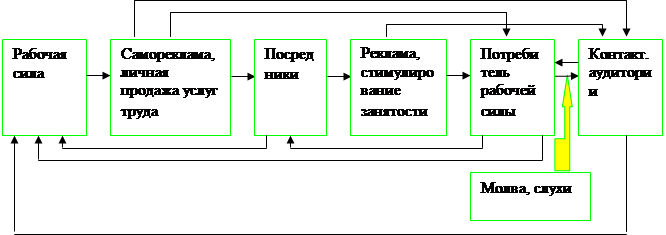 К системе коммуникаций в маркетинге рабочей силы относятся средства и процессы сбора и предоставления информации о рынке труда, предлагаемой рабочей силе и имеющихся рабочих местах, ведение переговоров о найме, т.е. все то, что позволяет и требует налаживания связей обмена информацией, понимания и согласия партнеров (рис Система коммуникаций в маркетинге рабочей силы