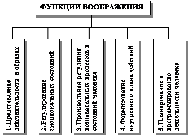 Воображение- это необходимый элемент творческой деятельности человека, выражающийся в построении образа продуктов труда, а обеспечивающий создание программы поведения в тех случаях, когда проблемная ситуация характеризуется также неопределённостью. В зависимости от различных обстоятельств, которыми характеризуется проблемная ситуация, одна и та же задача может решаться как с помощью воображения, так и с помощью мышления. Отсюда можно сделать вывод, что воображение работает на том этапе познания, когда неопределённость ситуации весьма велика. Фантазия позволяет «перепрыгнуть» через какие-то этапы мышления и всё-таки представить себе конечный результат.