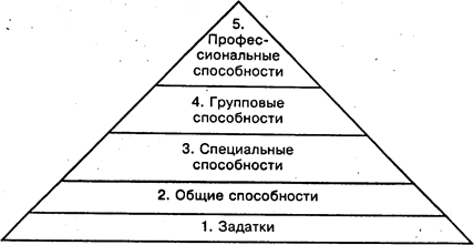 Основы способностей заложены генетически, они зависят от задатков. Так, люди могут овладеть членораздельной речью и логическим мышлением. Задатки на рисунке расположены в основании конуса. Далее представлены общие и специальные способности. Групповыми называют способности, которые группируются и развиваются на базе задатков, общих и специальных. В 16—18 лет, когда происходит выбор профессии, у личности меняется и структура способностей, проявляются профессиональные способности, которые и завершают конус. На рисунке продемонстрировано, как по мере развития способностей суживается диапазон возможностей, но зато увеличивается специализация способностей. Из рисунка также следует, что "конус способностей" формируется по направлению снизу вверх, а их разрушение идет в противоположном направлении.