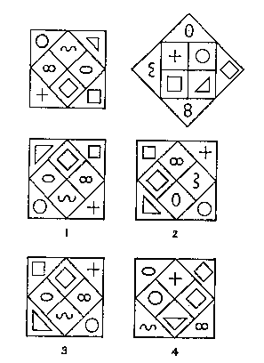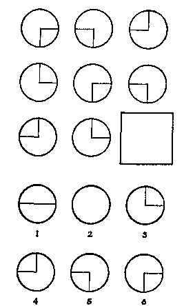 Каждый тест содержит сорок задач. У вас есть ограниченное время (см. выше) для того, чтобы ответить на все вопросы, поэтому работайте как можно быстрее. Не засиживайтесь слишком долго над каким-нибудь вопросом; возможно вы выбрали неверный путь решения, а следующую задачу вы сделаете лучше. С другой стороны, не сдавайтесь слишком легко; большинство задач можно решить, имея немного терпения. Полагайтесь лишь на свой здравый смысл, чтобы решить, когда отказаться от нерешенной задачи. И помните, что в целом сложность задач возрастает к концу теста. Любой человек способен правильно решить некоторое число задач, но никто не сможет правильно решить все задачи в отведенное время. Ваш ответ в каждом случае будет состоять из единственного числа, буквы или слова. Вы можете выбирать из нескольких предложенных вариантов или придумывать правильный ответ. Пишите свой ответ в указанном месте. Если вы не можете ответить на вопрос, не стройте догадок; однако если у вас есть идея, но вы не уверены полностью, что это действительно правильный ответ, все равно укажите ее. В тестах нет "хитрых" вопросов, но вам всегда придется рассматривать множество путей подхода к решению задачи. Убедитесь, что вы понимаете, что от вас требуется, прежде чем приступать к решению задачи; вы зря потратите время, если сразу перейдете к решению, не попробовав выяснить, в чем заключается задача. Для некоторых задач существуют альтернативные ответы, которые действительно удовлетворяют всем требованиям, на которые случайно может натолкнуться читатель. В этом случае читатель может считать свой ответ правильным.