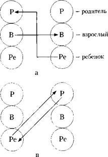 В этой схеме основой конфликта являются различные состояния субъектов взаимодействия, а «провокацией» конфликта — пересекающиеся трансакции. Комбинации «а» и «б» являются конфликтными. В комбинации «в» один из субъектов взаимодействия явно доминирует над другим или занимает позицию покровителя, другой субъект довольствуется ролью «ребенка». В этой комбинации конфликты не возникают по причине того, что оба субъекта принимают свои позиции как должное. Наиболее продуктивной в общении людей является позиция «г» (В