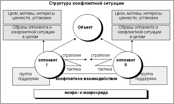 Структура конфликта понимается как совокупность устойчивых связей конфликта, обеспечивающих его целостность, тождественность самому себе, отличие от других явлений социальной жизни, без которых он не может существовать как динамически взаимосвязанная целостная система и процесс.