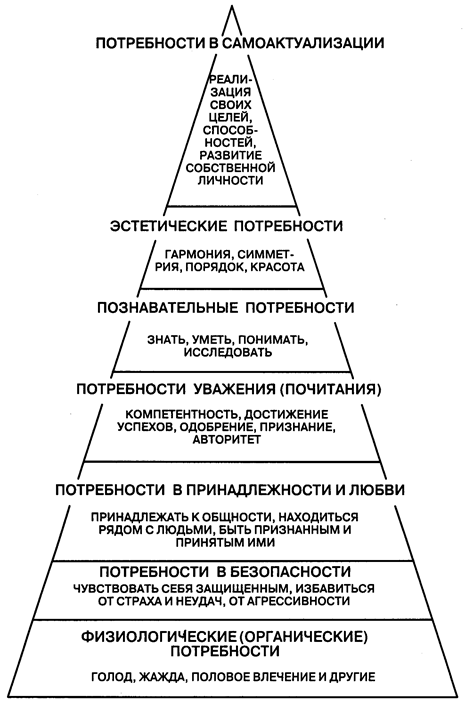 Еще более известная концепция мотивации поведения человека, принадлежит А. Маслоу. Чаще всего, когда говорят о данной концепции, имеют в виду существование иерархии человеческих потребностей и их классификацию, предложенную Маслоу. Согласно данной концепции, у человека с рождения последовательно появляются и сопровождают его взросление семь классов потребностей (рис. 22.2): физиологические (органические) потребности, потребности в безопасности, потребности в принадлежности и любви, потребности уважения (почитания), познавательные потребности, эстетические потребности, потребности в самоактуализации. Причем, по мнению автора, в основании данной мотивационной пирамиды лежат физиологические потребности, а высшие потребности, такие как эстетические и потребность в самоактуализации, образуют ее вершину.