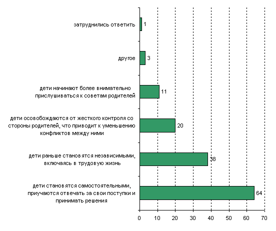 Психологический мотив более сильно выражен у тех респондентов, по мнению которых дети должны жить отдельно от родителей. В этом случае 10% считают, что дети более внимательно прислушиваются к советам родителей, а 20% — что территориальное разделение поколений приводит к уменьшению конфликтов. Негативное же последствие отделения — появление "отчужденности в отношениях между родителями и детьми" (19%).