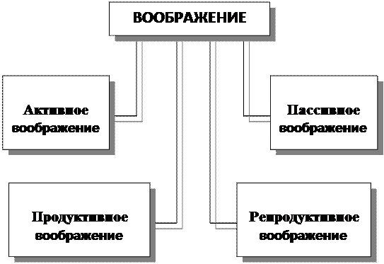 Воображение характеризуется активностью, действенностью. Опережающее отражение действительности происходит в воображении в виде ярких представлений, образов. Для более полного представления о видах и способах воображения можно воспользоваться схемой [8,299].