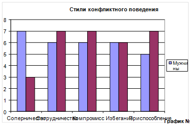 По графику №1 стили конфликтного поведения выявлено: у мужчин в большей степени выражен стиль конфликтного поведения соперничество, у женщин - в меньшей степени. Такой стиль поведения, в большей степени свойственный активным и агрессивным представителям мужского пола с мотивацией активно-оборонительного поведения или самоутверждения в качестве доминирующих мотиваций. У мужчин в меньшей степени выражен стиль приспособление, чем у женщин.