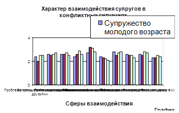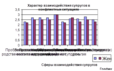 По графику №2 характер взаимодействия супругов в конфликтных ситуациях выявлено: Мужчины более пассивны, чем женщины за исключением сфер, связанных с рассогласованием норм поведения и проявление ревности.