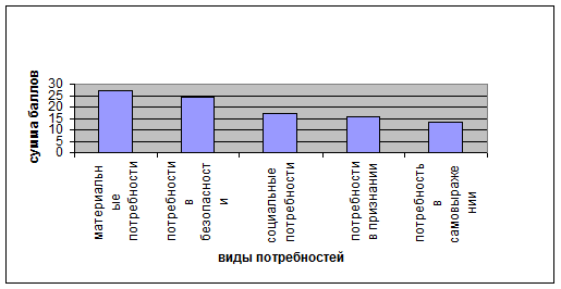 При проведении методики диагностики степени удовлетворенности основных потребностей выяснено: ведущими потребностями испытуемых являются материальные потребности и потребности в безопасности (в среднем 14 и 10 баллов соответственно). Связано это, на наш взгляд, с тем, что у врачей и среднего медицинского персонала невысокая заработная плата, вследствие чего люди ощущают себя материально незащищенными.