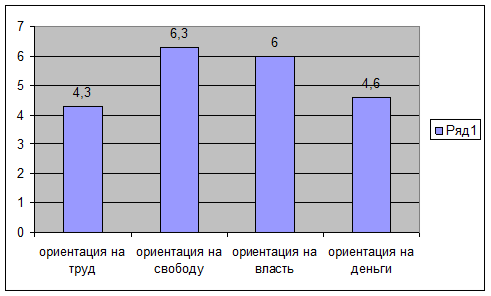 2. Сумма ответов на вопросы 2, 6, 10, 14, 18, 22, 26, 30, 34, 38 – «ориентация на свободу». Главная ценность этих людей – свобода. Очень часто ориентация на свободу сочетается с ориентацией на труд, реже сочетание «свобода» и «деньги».