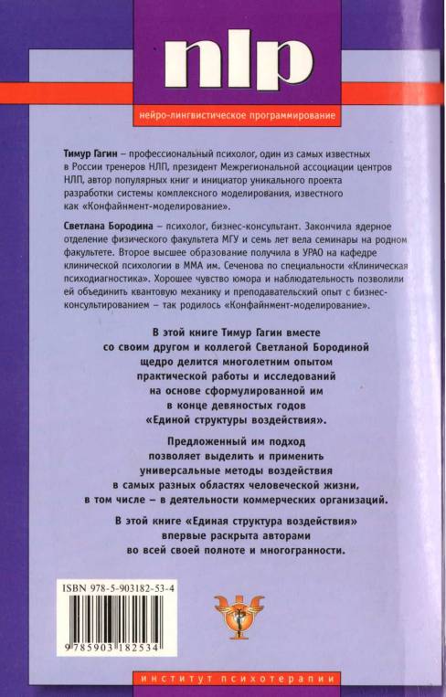В этой книге Тимур Гагин, профессиональный психолог, один из самых известных в России тренеров НЛП, президент Межрегиональной ассоциации центров НЛП, автор популярных книг и инициатор уникального проекта разработки системы комплексного моделирования, известного как «Конфайнмент-моделирование», вместе со своим другом и коллегой Светланой Бородиной щедро делится многолетним опытом практической работы и исследований на основе сформулированной им в конце девяностых годов «Единой структуры воздействия». Предложенный им подход позволяет выделить и применить универсальные методы воздействия в самых разных областях человеческой жизни, в том числе - в деятельности коммерческих организаций.