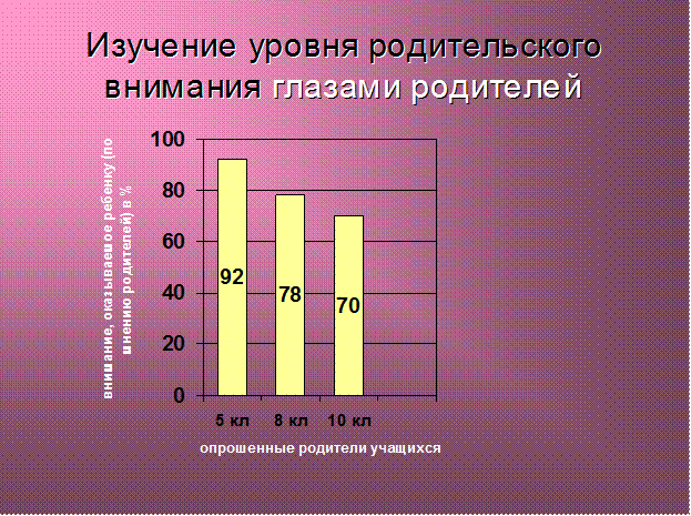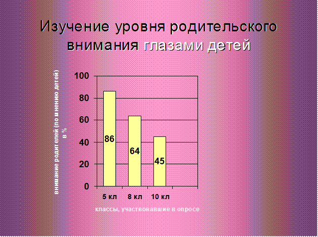 В итоге были получены следующие результаты: родители более внимательны к своим детям, когда они еще маленькие – 86% родителей учащихся 5-ых классов уделяют им достаточно внимания (это по мнению детей). А по мере взросления этот показатель снижается: в 8-ых классах – 64%, а в 10-ых классах – 45%.
