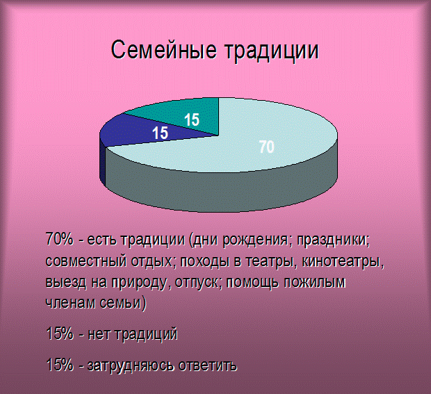 Нами исследовались и традиции в семьях учащихся нашей школы с целью получения дополнительных сведений о взаимоотношениях в семье между родителями и детьми. Так же были опрошены учащиеся 5-ых, 8-ых, 10-ых классов. 70% из них (из 435 учащихся) ответили, что у них есть семейные традиции, под которыми они понимают: празднование дней рождения членов семьи, различных праздников, таких как Новый год. Рождество, 23 февраля, 8 марта и т.д., совместный семейный отдых: выезды на природу, поездки на море, походы в кино, в театр, помощь бабушкам и дедушкам. 15% опрошенных учеников ответили, что они затрудняются ответить на вопрос, а следующие 15% ответили, что у них нет традиций.