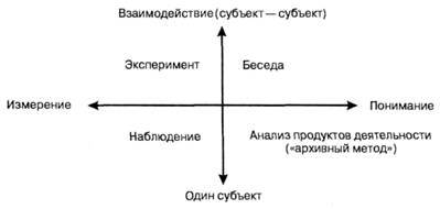 В квадратах, образованных этими осями, можно расположить основные психологические эмпирические методы (рис. 2.5).