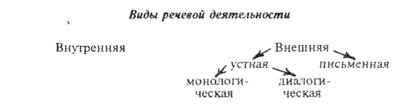 Итак, речь — это вербальная коммуникация, т.е. процесс общения с помощью языка. Различают следующие виды речи: внешняя и внутренняя. Внешняя речь подразделяется, в свою очередь, на устную и письменную, а устная — на монологическую и диалогическую:
