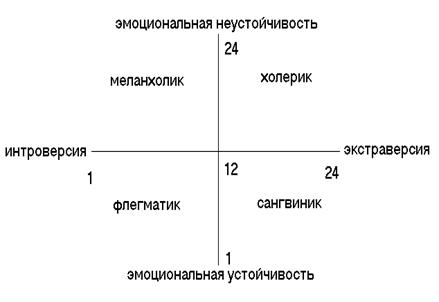 Начертите оси координат: горизонтальная ось - "шкала экстраверсии", вертикальная ось - "шкала эмоциональной устойчивости". Каждая шкала от 1 до 24, пересекаются в точке 12. Отметьте свои показатели на осях. Найдите точку пересечения. Точка может лежать на оси, если одна из шкал равна 12.