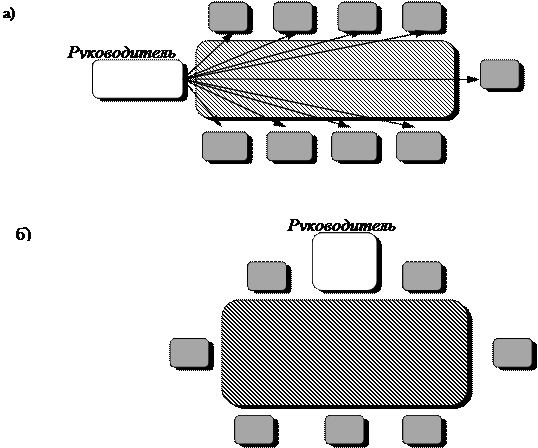 Лидер такого типа, обладая достаточной властью, навязывает свою волю исполнителям, единолично принимает и отменяет решения, не дает возможности проявить инициативу подчиненным, категоричен, часто резок с людьми. Всегда приказывает, распоряжается, наставляет, но никогда не просит. Основное содержание его управленческой деятельности состоит из приказов и команд. Все новое воспринимается таким руководителем с осторожностью, или вообще не воспринимается , в управленческой работе он практически пользуется одними и теми же методами. Таким образом, вся власть сосредоточивается в руках такого руководителя, получившего название автократа. Даже размещение сотрудников в процессе проведения совещания ориентировано на постоянный контроль их деятельности (Рис. 2а.). Это создает напряженную обстановку, подчиненные в этом случае сознательно или интуитивно стремятся избегать тесного контакта с таким руководителем.