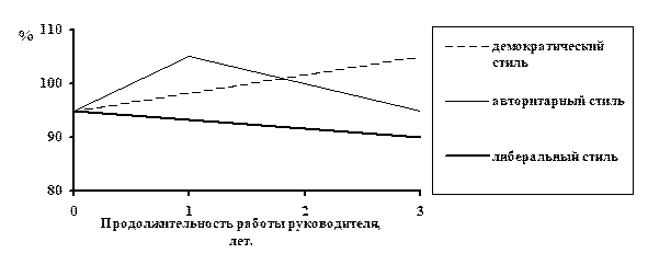 Влияние типов лидерства на эффективность работы групп в течение продолжительного времени исследовали и немецкие ученые. Было установлено, что результативность труда постоянно повышалась у коллектива, где преобладал демократический стиль руководства, снижение эффективности – у коллектива с либеральным и авторитарным стилем.