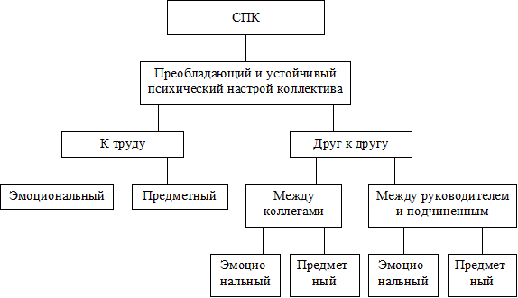 СПК коллектива всегда характеризуется специфической для совместной деятельности людей атмосферой психического и эмоционального состояния каждого его участника, индивида и несомненно зависит от общего состояния окружающих его людей. В свою очередь атмосфера той или иной общности или группы проявляется через характер психической настроенности людей, которая может быть деятельной или созерцательной, жизнерадостной или пессимистичной, целеустремленной или анархичной, будничной или праздничной и так далее.
