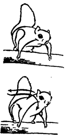 Рис. 1. Специфические движения летяги для определения удаленности предметов. Летяга «прицеливается» перед прыжком: приподнявшись, животное производит боковые движения головой в горизонтальной плоскости. Подобные ориентирующие движения животные производят особенно часто при передвижении в незнакомой местности.