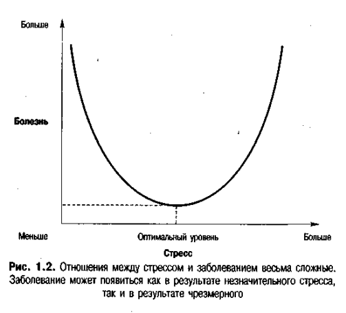 Оптимальная цель — ограничить вредоносный эффект стресса, поддерживая качество и активность образа жизни. Ряд исследователей обнаружили, что отношения между стрессом и болезнью можно изобразить в виде U-образной кривой, как показано на рис. 1. Если стрессовое воздействие сильно, то и серьезность заболевания будет соответствующей. Однако данная кривая также указывает на то, что тяжелое заболевание может возникнуть даже в течение минутного стресса. Эти же исследователи обнаружили, что существует оптимальный уровень стресса — не слишком много и не очень мало, который имеет профилактический характер.
