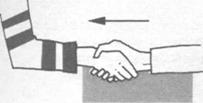 Доминирование передается путем поворота вашей руки (см. рисунок, полосатый рукав) таким образом, что ладонь во время рукопожатия оказывается повернутой вниз. Ладонь необязательно должна быть повернут строго вниз, но при этом ваша рука все равно оказывается сверху. Тем самым вы показываете собеседнику, стремитесь получить контроль над ситуацией.