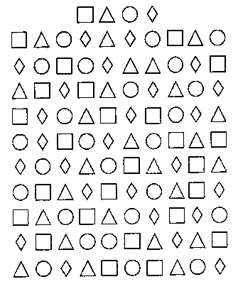 Вам предложен тест с изображенными на нем квадратом, треугольником, кругом и ромбом. По сигналу "Начали" расставьте как можно быстрее и без ошибок следующие знаки в эти геометрические фигуры: в квадрат – плюс, в треугольник – минус, в кружок – ничего не ставьте и в ромб – точку. Знаки расставляйте подряд построчно. Время на работу отпущено 60 секунд. По сигналу "Стоп!" расставлять знаки прекратите.
