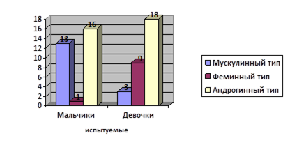 По группе испытуемых девочек были получены следующие данные: лишь у 30% девочек из всей выборки феминный тип личности, 60% девочкам присущ андрогинный тип личности и у 10% испытуемых девочек выявлен мускулинный тип. Анализируя полученные данные мы можем сказать, что соответствие "психологическому" полу больше у мальчиков, чем у девочек того же возраста.