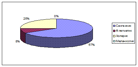 По результатам теста Стреляу, подразумевающему исследование типологических особенностей нервной системы, определение своего типа нервной системы и темперамента, можно сделать вывод, на основе исследования группы из 12 человек, что в данной группе преобладают студенты с темпераментом сангвиника, имеющие живой, уравновешенный тип нервной системы. Таких студентов 8 человек. Темперамент флегматика, со спокойным, уравновешенным типом нервной системы, представлен только одним человеком в группе. Оставшиеся 3 человека являются представителями холеристического типа темперамента, обладающие безудержным, неуравновешенным типом нервной системы. Меланхоликов в исследуемой группе выявлено не было.