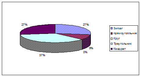 Результат проведения психогеометрического исследования показал, что треугольники на первое место поставили 4 человека, зигзаг и квадрат на первое место поставили по 3 человека, круг и прямоугольник поставили по одному человеку соответственно. По данным этого теста можно сделать вывод, что в группе преобладают лидеры, второе же место делят люди, склонные к трудолюбию и люди эмоциональные, склонные к творчеству. Подобные качества не менее важны лидерства в профессии менеджер по персоналу.