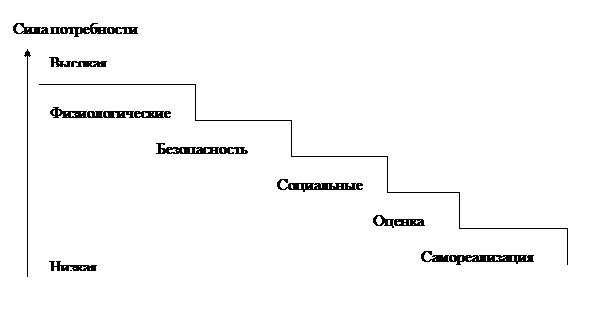 Потребности удовлетворяются в том порядке, в котором они представлены в пирамиде, - от низших к высшим. Потребности более высокого порядка не могут проявиться, пока не удовлетворены низшие. Удовлетворение всех потребностей приводит человека на вершину пирамиды – к полной самореализации. Чем сильнее не удовлетворена потребность, тем выше вероятность ее актуализации, готовности проявить себя. Отсюда вывод: потенциал потребности – это функция от степени ее неудовлетворенности. Реальный потенциал любой потребности независимо от ее уровня прямо пропорционален степени ее неудовлетворенности.