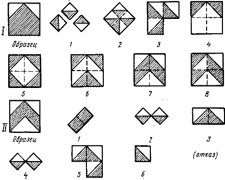 Как легко видеть, проба (Коса предполагает выделение из непосредственно воспринимаемого контура, который должен быть выложен из отдельных кубиков, нужных конструктивных элементов, которые, как это видно при ближайшем анализе данной пробы (см. III, 6, г), не совпадают с непосредственным впечатлением. Задача может быть правильно решена лишь в том случае, если будет проделана такая предварительная работа по перешифровке «элементов впечатления» в «элементы конструкции».