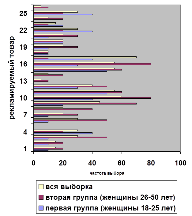 | Товар | Первая группа (женщины от 18 до 25 лет ) | Вторая группа (женщины от 26 до 50 лет) |