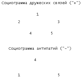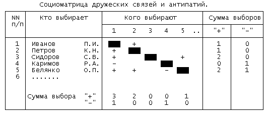 Значительными возможностями по сравнению с остальными методами диагностики располагает социометрия - совокупность приемов и средств, используемых для изучения групповой динамики (авторитетность, лидерство, сплоченность и т.п.). Для выявления в коллективе "неуставщины" методом социометрии необходимо выбрать социометрический критерий, изготовить социометрические карточки по числу членов группы и список группы. Вариант социометрической карточки, социоматрицы и социограмм дружеских связей и антипатий приведен в приложении 2.
