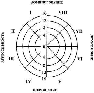 Для представления основных социальных ориентации Т. Лири разработал условную схему в виде круга, разделенного на секторы. В этом круге по горизонтальной и вертикальной осям обозначены четыре ориентации: доминирование-подчинение, дружелюбие-враждебность. В свою очередь эти секторы разделены на восемь – соответственно более частным отношениям. Для еще более тонкого описания круг делят на 16 секторов, но чаще используются октанты, определенным образом ориентированные относительно двух главных осей.