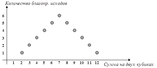 Пример 1. Подбрасываются два игральных кубика, подсчитываются суммы выпавших очков (суммы числа очков на верхних гранях обоих кубиков). Сумма выпавших очков на двух кубиках может меняться от 2 до 12. Записать полную группу событий в этом опыте.