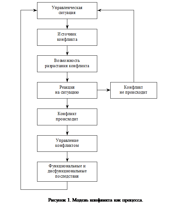 На рисунке 1 представлена модель конфликта как процесса. Из нее видно, что существование одного или более источников конфликта увеличивает возможность возникновения конфликтной ситуации в процессе управления. Однако, даже и при большей возможности возникновения конфликта, стороны могут не захотеть реагировать так, чтобы и дальше усугублять ситуацию. Одна группа исследователей обнаружила, что люди не всегда реагируют на конфликтные ситуации, которые влекут за собой малые потери или которые они считают малоопасными. Другим словами, иногда люди понимают, что потенциальные выгоды участия в конфликте не стоят затрат. Их отношение к этой ситуации выражается следующим: «На этот раз я разрешу ему поступить по-своему».