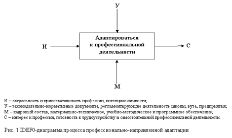 Процесс профессионально-направленной адаптации личности начинается еще в школе при выборе профиля обучения и будущей профессии, охватывает период пребывания в учреждениях профессионального образования и период вхождения в профессиональную среду. Поэтому его можно рассматривать как систему, состоящую из нескольких подсистем – довузовской, вузовской и послевузовской адаптации. Для определения оптимальных путей повышения эффективности процесса адаптации студентов мы использовали методологию функционального моделирования IDEF0 [3].